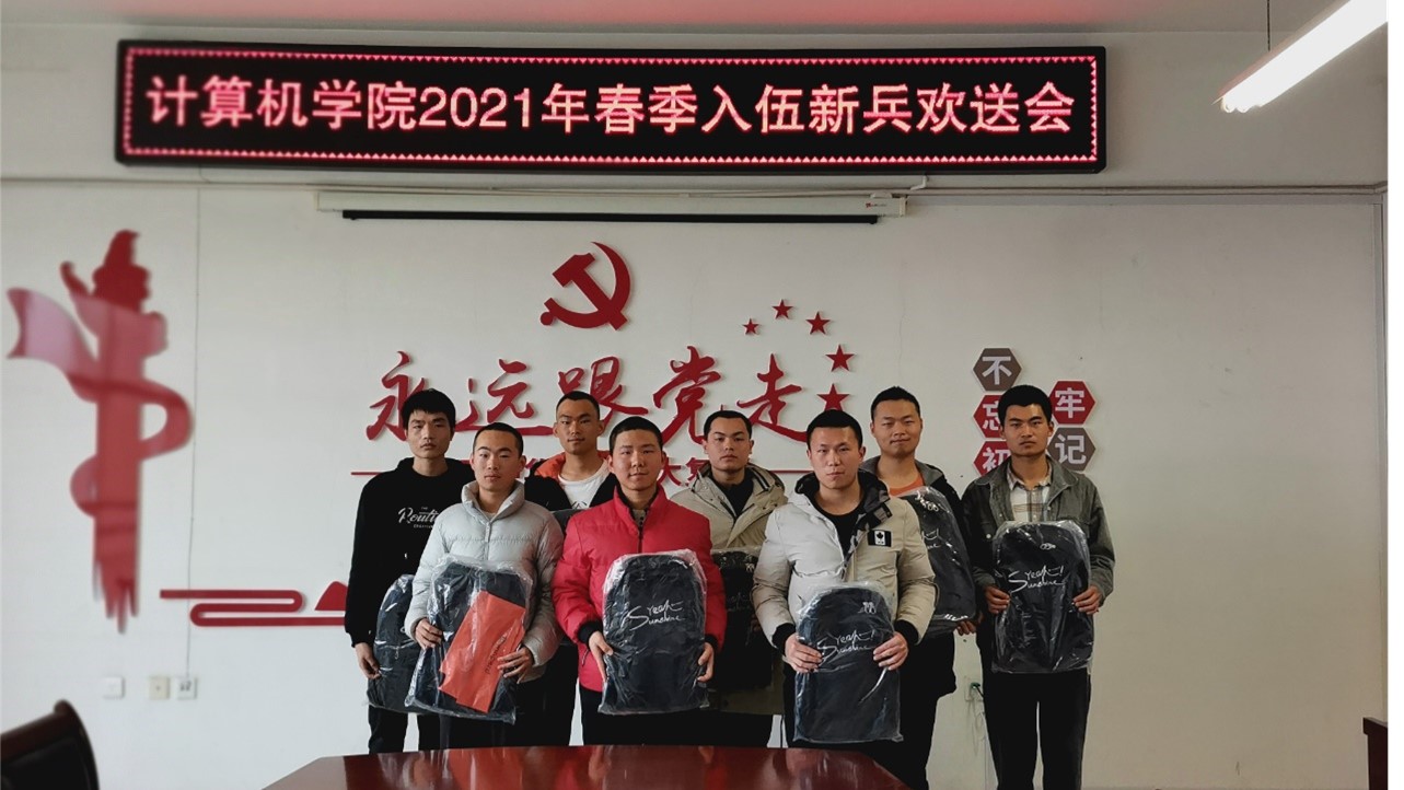 3月8日下午,太阳成集团tyc151在A-06 309会议室召开2021年春季应征入伍新兵欢送会,党总支副书记杨聪聪、辅导员杨正平、张凯、牛培全参加欢送会。