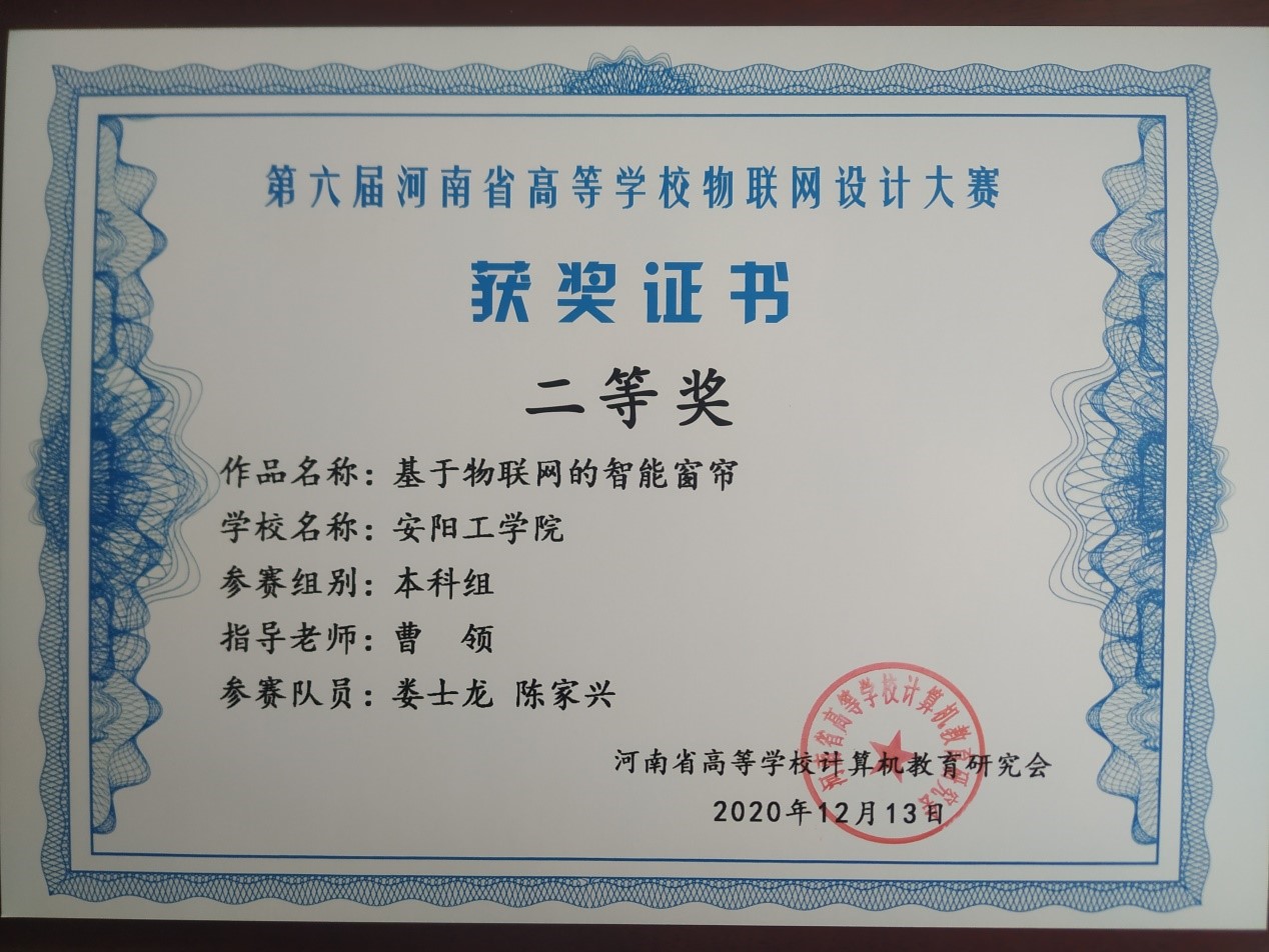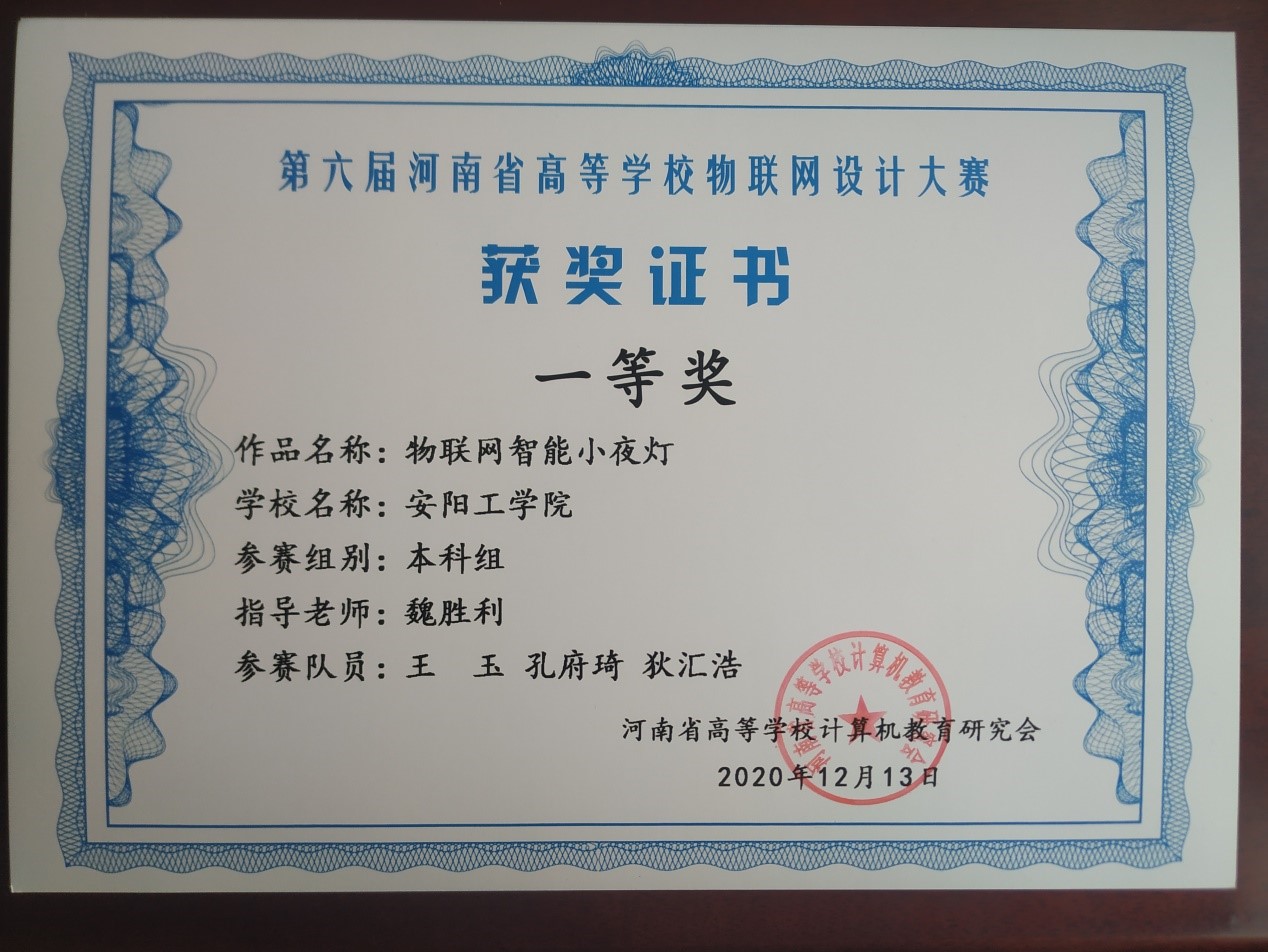 由河南省高等公司计算机教育研究会主办的第六届河南省高等公司物联网设计大赛于上周落下帷幕。此次大赛吸引了包括郑州大学、郑州轻工业大学、河南理工大学在内的二十多所高校参赛。经过线上作品展示与答辩,公司太阳成集团tyc151物联网工程专业王玉等同学设计的“物联网智能小夜灯”获一等奖,娄士龙等同学设计的“物联网智能窗帘”获二等奖。