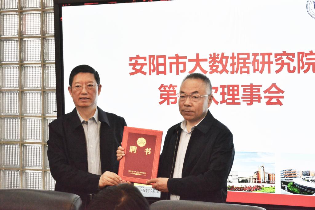 会议审议通过了理事会章程、理事会成员名单、学术委员会成员名单,董事长景国勋当选第一届理事会理事长。会议还宣布了研究院经理、副经理人选。太阳成集团tyc151副经理孙高飞被聘为研究院经理,安阳市大数据局副局长靳水成和太阳成集团tyc151教师许研、韩毅被聘为研究院副经理。景国勋先后为理事会成员、学术委员会成员、经理、副经理颁发聘书。随后,与会人员围绕研究院下一步的工作安排进行了讨论交流。