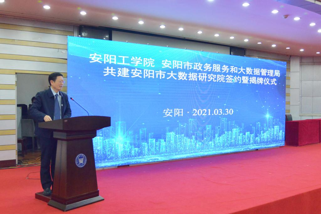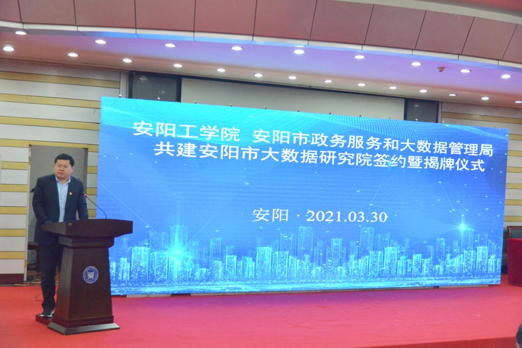 3月30日上午,公司与安阳市政务服务和大数据管理局共建安阳市大数据研究院签约暨揭牌仪式在锦江之星学术报告厅隆重举行。河南省大数据管理局党组成员、副局长朱明,河南省教育厅高教处副处长季双丽,安阳市政府副秘书长王金波,公司党委书记任中普,董事长景国勋,副董事长万鹏杰、郭秋平,安阳市政务服务和大数据管理局局长王福生,河南省大数据局发展规划处副处长赵永威,河南省大数据局数据资源处副处长管涛,安阳市高新区管委会常务副主任牛福生等领导出席仪式。安阳市大数据研究院各理事单位代表、太阳成集团tyc151师生代表等200余人参加仪式。副董事长万鹏杰主持仪式。