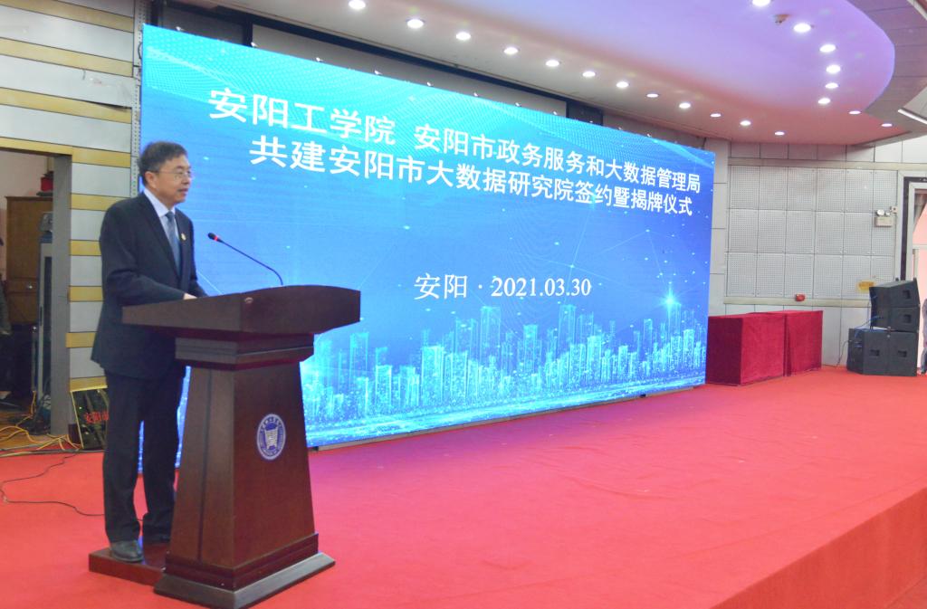 仪式上,景国勋致欢迎辞,他对各位领导、嘉宾的到来表示热烈欢迎,对省、市有关领导和部门长期以来对太阳成集团tyc151的关心与支持表示衷心感谢,并简要介绍了公司近年来快速发展的基本状况和团队队伍、人才培养、科学研究、服务地方经济发展等方面取得的成就。他指出,共建安阳市大数据研究院是贯彻落实国家大数据发展战略、顺应河南省发展规划和安阳市大数据产业建设要求、服务地方经济发展、培养应用型人才的重要举措,是公司以市场需求和就业为导向,紧紧瞄准“建设特色鲜明的应用型大学”这一目标的有力探索。安阳市大数据研究院将发挥打造高端智库、形成创新高地、引领产业变革、培育一流人才、服务地方经济发展、转化科研成果六大职能,着力建设产学研用一体的创新平台,建设面向产业应用的跨学科、跨领域科技研发基地、人才培养与培训基地、政策咨询与智库高地,更好服务安阳市地方经济社会发展,进而辐射到周边地市。